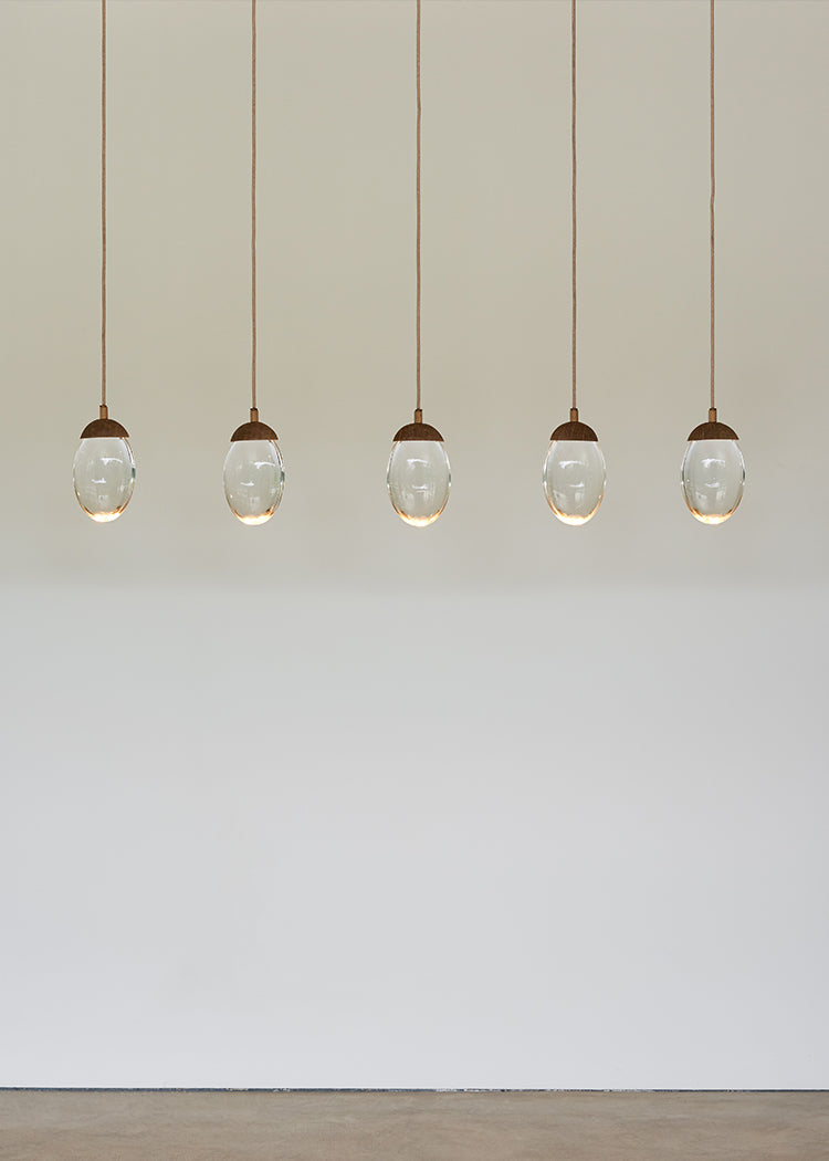 pendant with solid glass drop illuminated by LEDs, fitted with carved oak cap and matching canopy