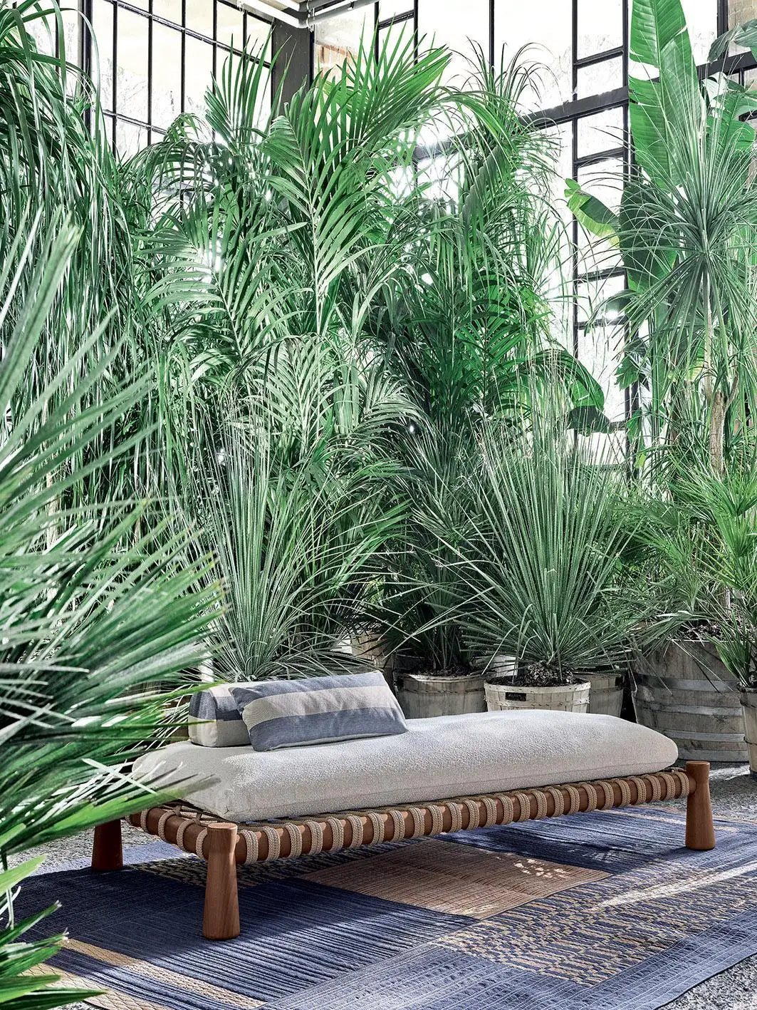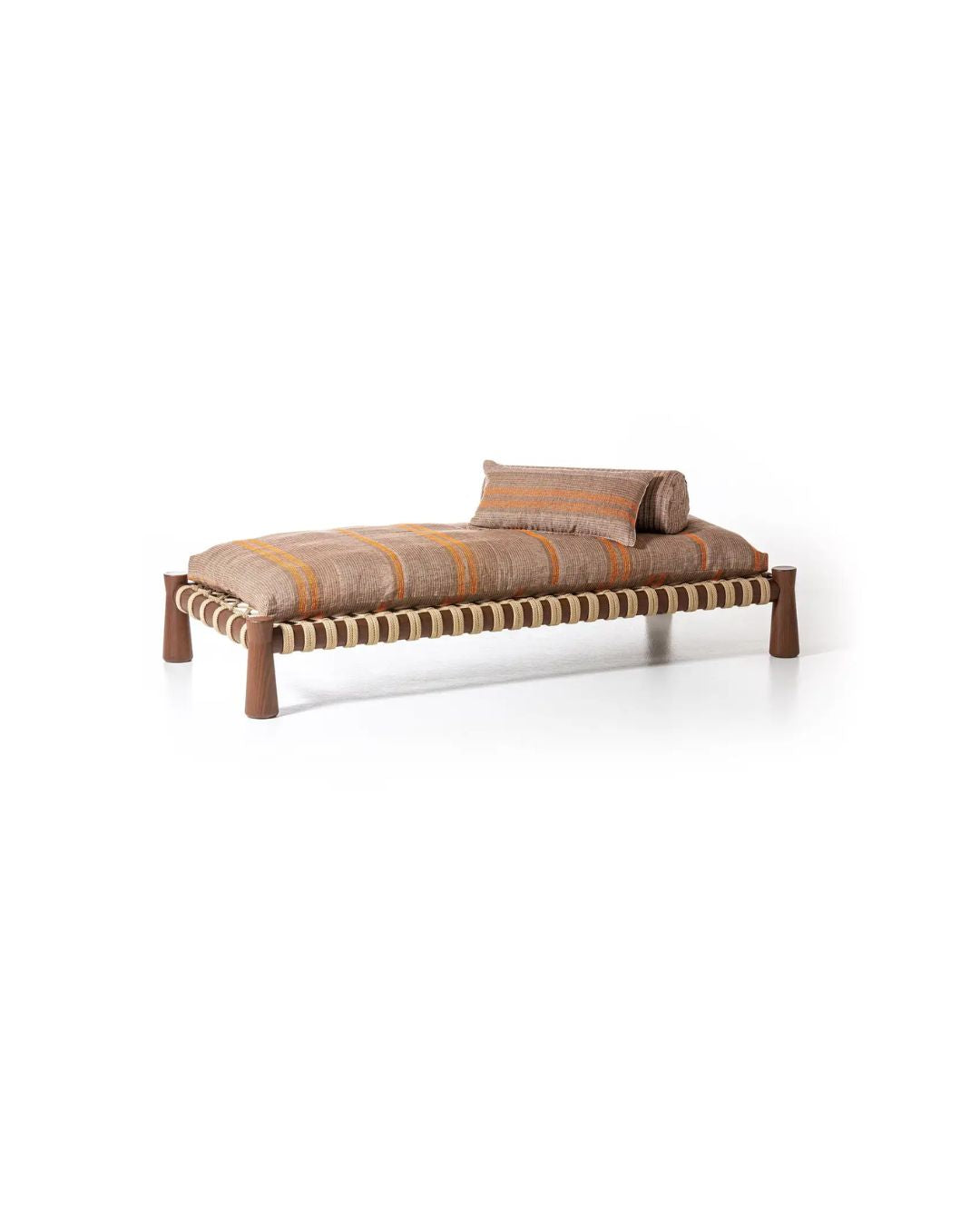 A traditional Indian bed that is low and spacious, the charpoy is reinterpreted by Chiara Andreatti through the use of nautical ropes in natural, red and blue, woven by hand to the structure in Iroko wood treated for outdoor use, characterised by the particular flared design of the legs, on which the seat cushions rest. Available in two sizes 195x95 and 120x100 to move the space.