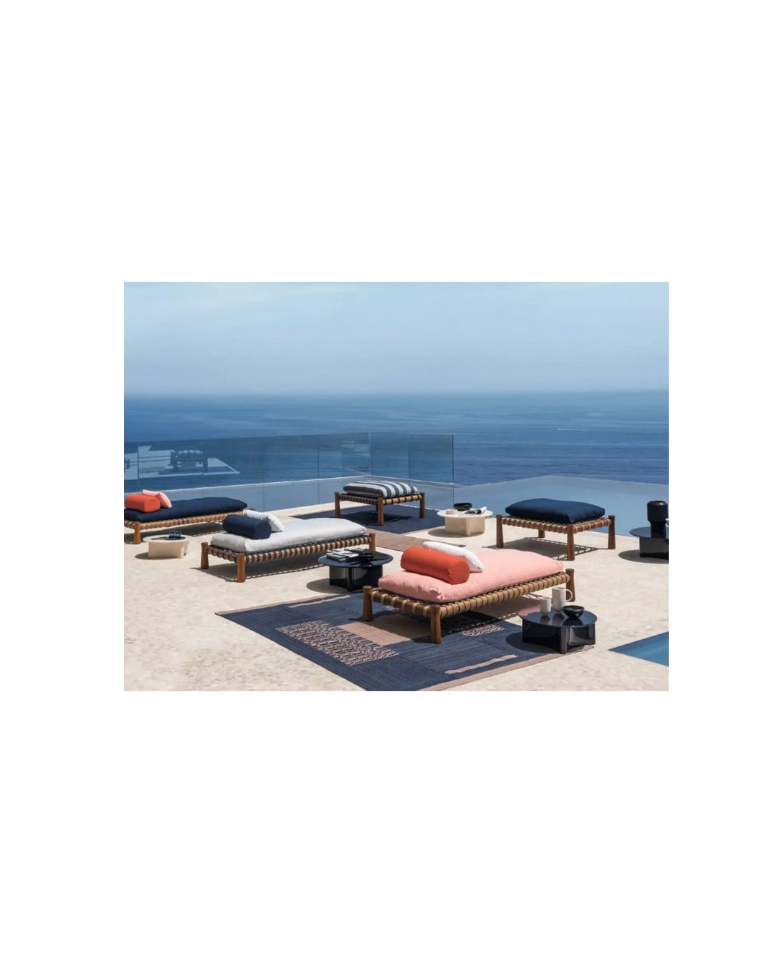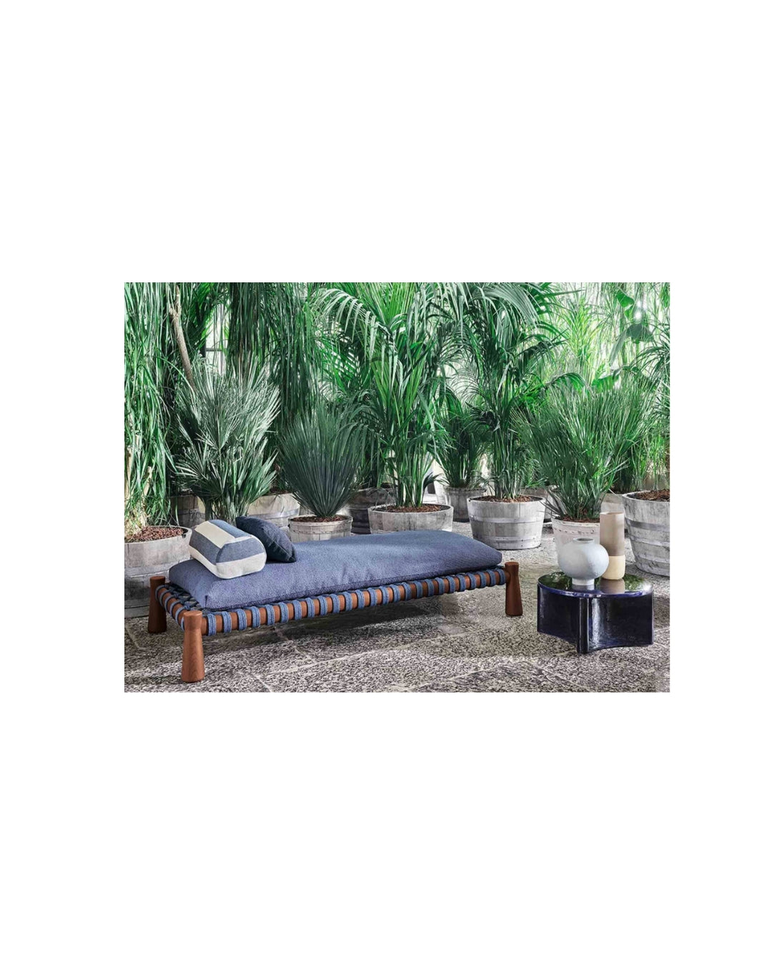 A traditional Indian bed that is low and spacious, the charpoy is reinterpreted by Chiara Andreatti through the use of nautical ropes in natural, red and blue, woven by hand to the structure in Iroko wood treated for outdoor use, characterized by the particular flared design of the legs, on which the seat cushions rest.