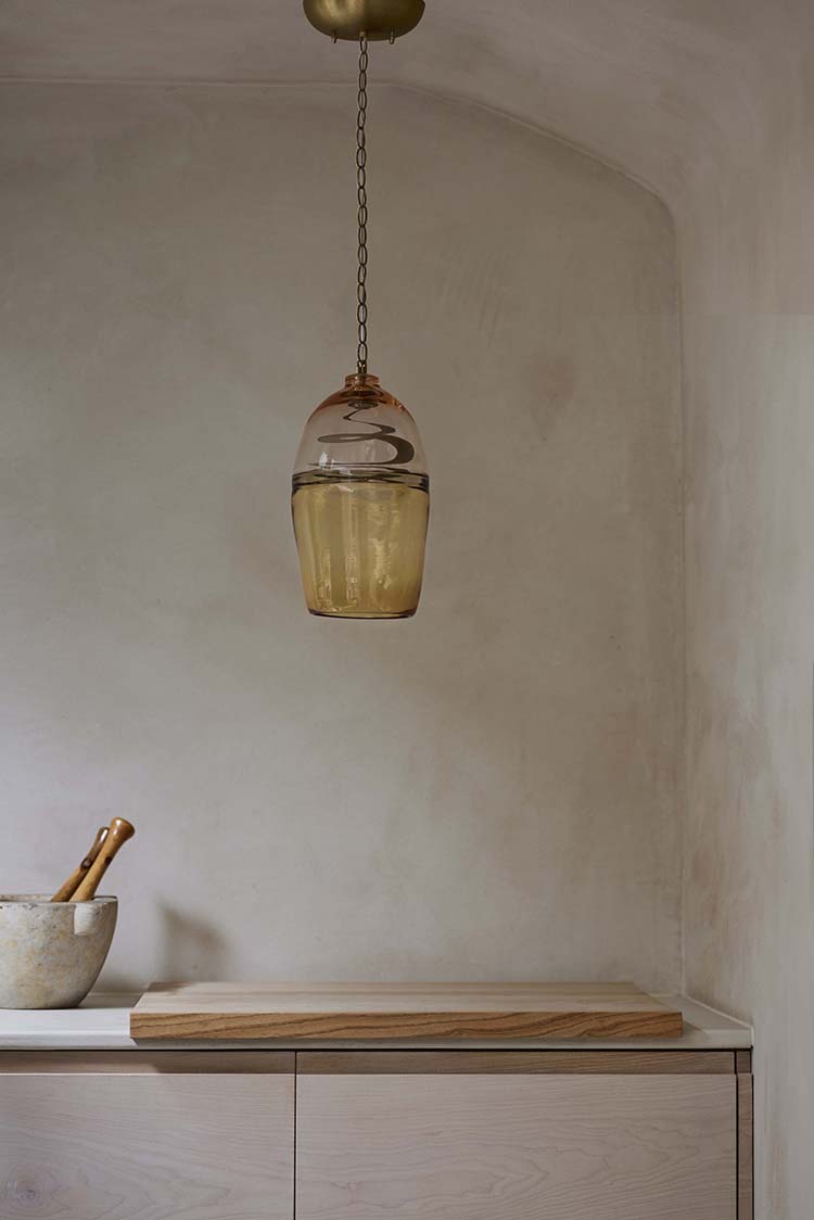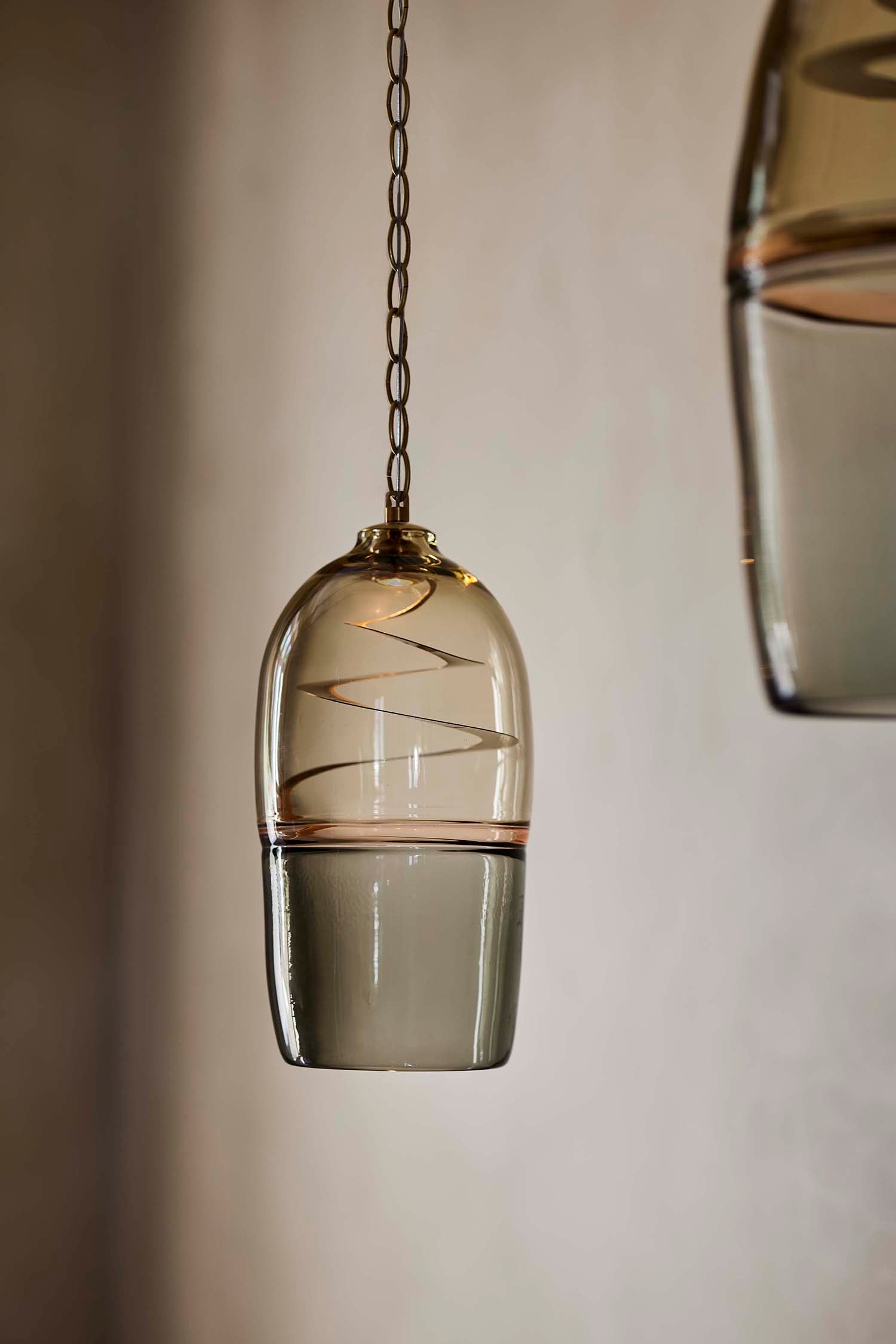 hand blown murano glass in cool, natural or warm hues, suspended by patinated brass chain